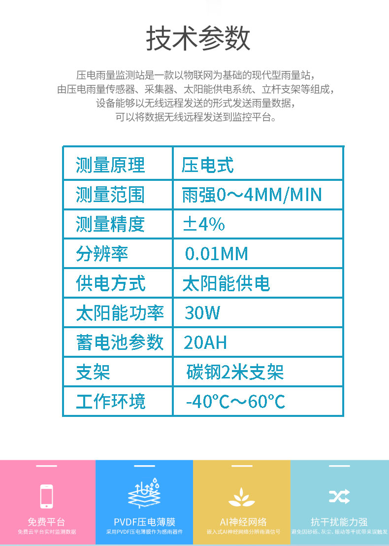 1.壓電雨量傳感器采用PVDF壓電薄膜作為感雨器件,通過嵌入式AI神經(jīng)網(wǎng)絡(luò)分辨雨滴信號,避免因砂礫、灰塵、振動等干擾帶來誤觸發(fā),一體化設(shè)計,外觀精美